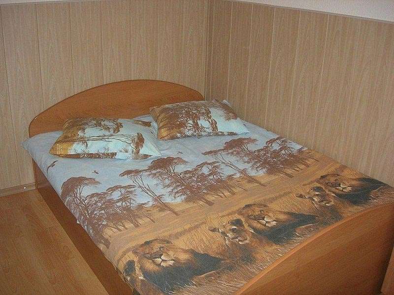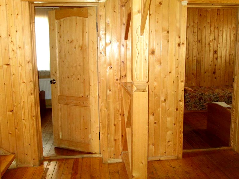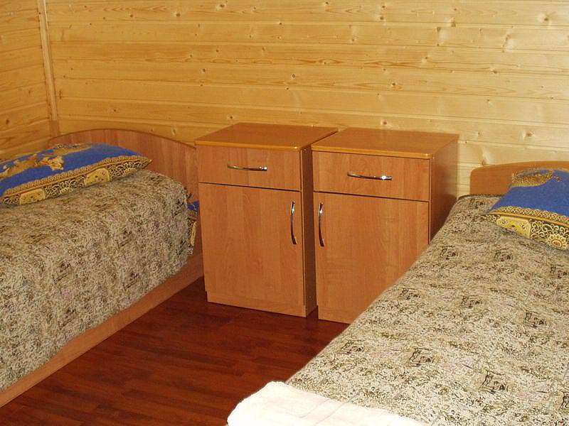 Каждый номер имеет свой вход с улицы. В одном номере установлена двуспальная кровать, в двух других по две односпальных кровати. В каждом номере есть холодильник, электрический чайник, телевизор.