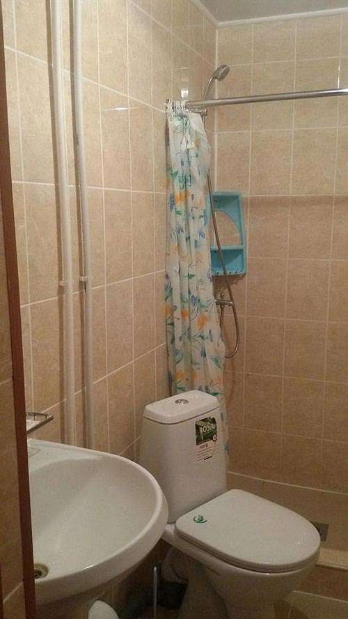 В трехместном номере стоят три одноместных кровати, шкаф для одежды, тумбочка, телевизор. Есть своя туалетная комната с душевой кабиной.