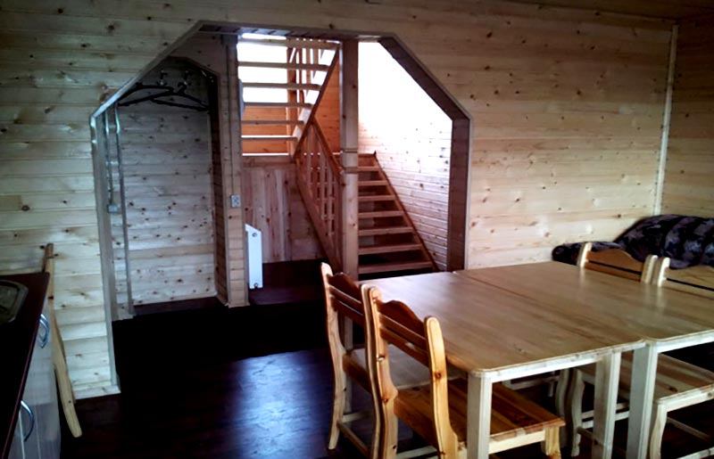 На первом этаже уютная общая гостиная, в которой находиться мягкий диван и телевизор, обеденный стол, стулья. В доме есть микроволновая печь и холодильник, электрический чайник, варочная поверхность, вытяжка, набор посуды. Две туалетные комнаты с душем на первом и на втором этаже. Всего в доме пять спальных комнат, в каждой стоит по две одноместных кровати и тумбочки для личных принадлежностей.
